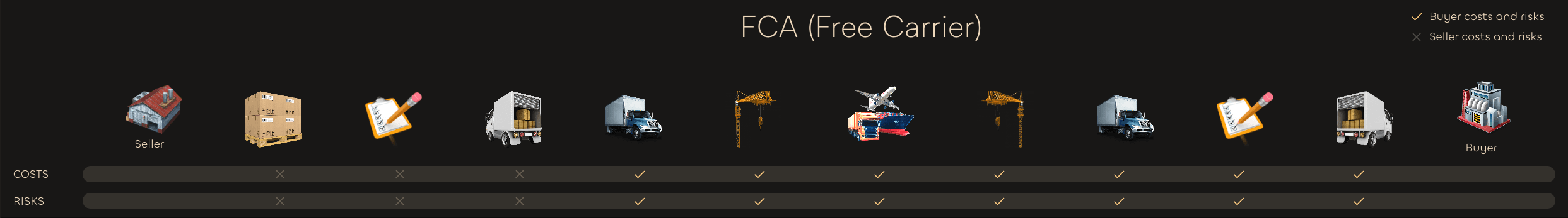 With the Incoterm FCA, the seller is responsible for delivering the goods to the carriers designated by the buyer. The seller assumes the costs and risks up to the delivery, while the buyer takes charge of the main transport and associated costs.