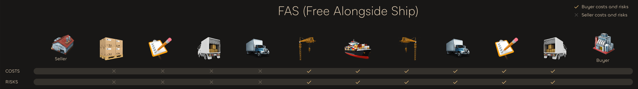 FAS – Free Alongside Ship - Free Delivery Alongside the Ship (named place of delivery port)