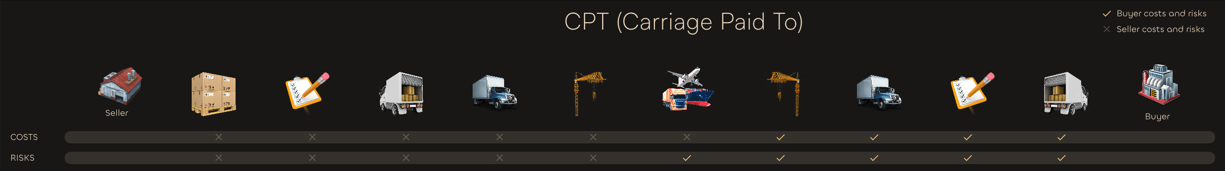 The Incoterm CPT means that the seller pays for the transportation of the goods to an agreed destination. However, the risk of loss or damage is transferred to the buyer as soon as the goods are delivered to the first carrier.