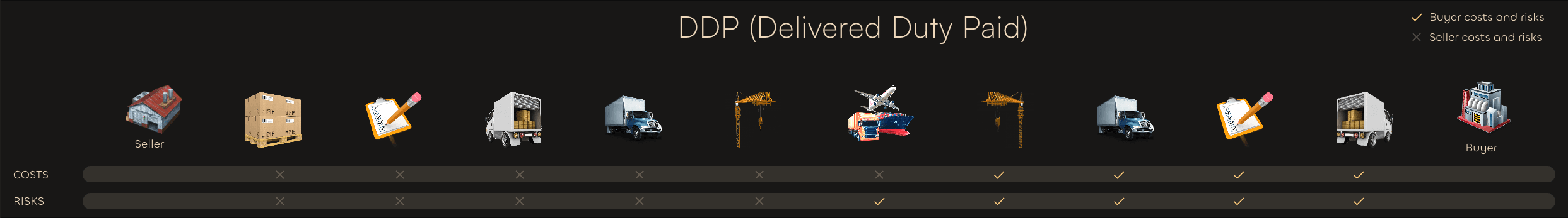 With the DDP Incoterm, the seller assumes responsibility for all costs and risks associated with delivering the goods, including payment of import duties and taxes.