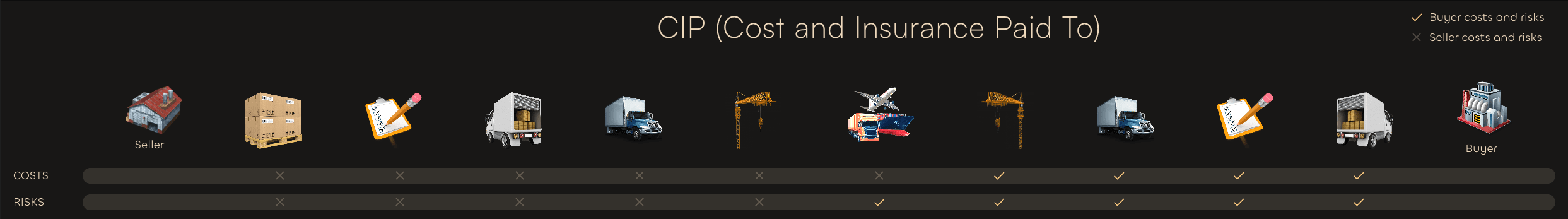 With the CIP Incoterm, the seller assumes the same responsibilities as in the CPT, but must also take out insurance to cover the risk of loss or damage during transport. The buyer becomes responsible for the goods once they are handed over to the first carrier.