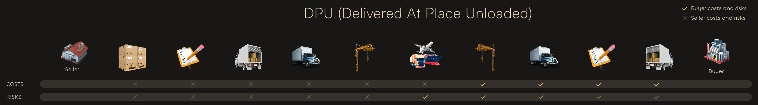 DPU is similar to DAP, but the seller is also responsible for unloading the goods at the agreed destination. The buyer still has to take care of customs clearance and payment of duties and taxes.