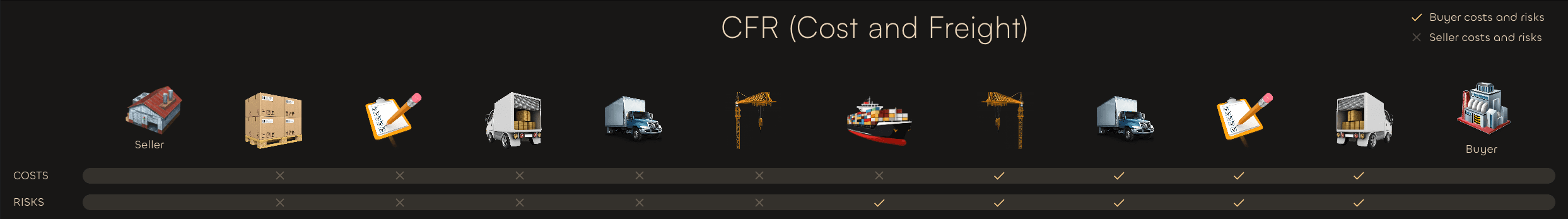 With the Incoterm CFR, the seller assumes the costs of transport and freight charges up to the destination port. However, the risk of loss or damage is transferred to the buyer once the goods are loaded onto the ship.